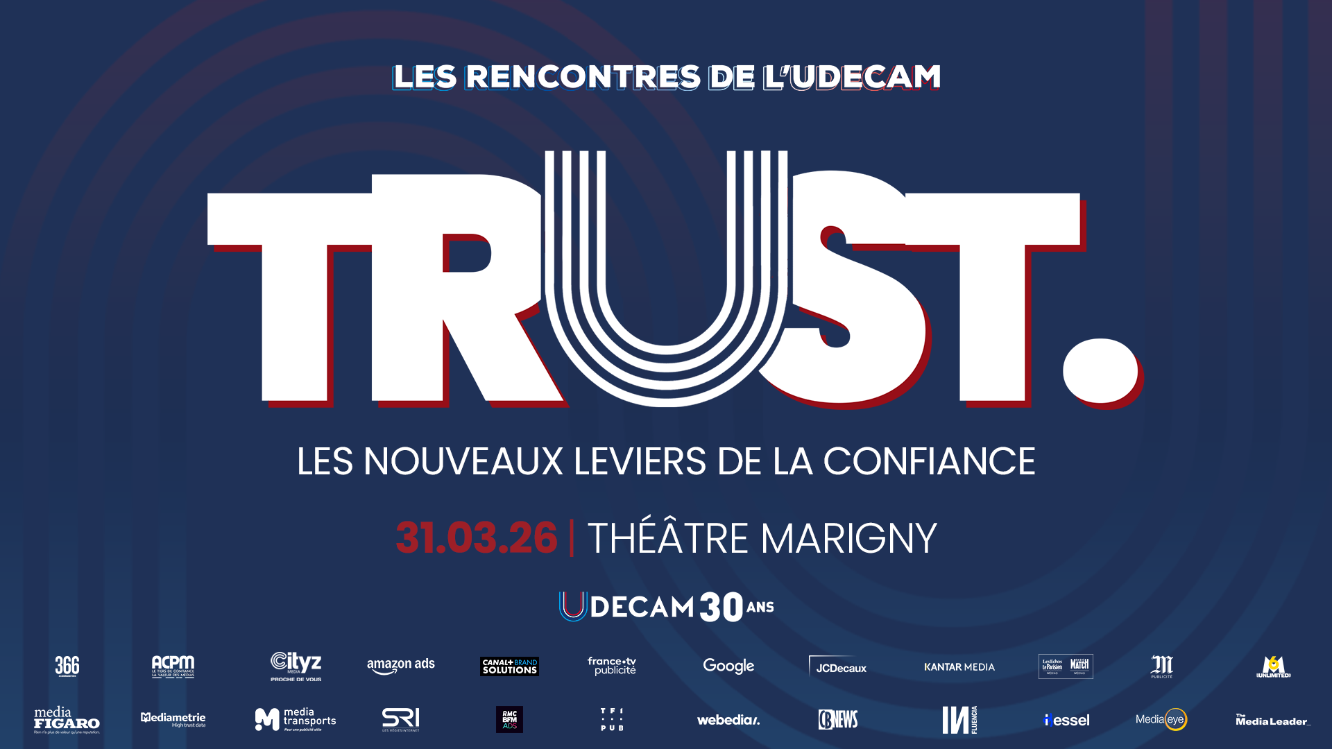 Pour ses 30 ans, l’UDECAM frappe fort : les Rencontres 2026 investissent le Théâtre Marigny le 31 mars pour une soirée de conférence placée sous le thème « Trust – Les nouveaux leviers de la confiance ». À travers des prises de parole de haut niveau, l’événement entend décrypter comment la confiance se construit, se maintient et se transmet pour les agences, les marques, les médias et les institutions. La soirée se prolonge avec un apéritif networking de 20h00 à 21h30, avant un dîner de gala au Pavillon Ledoyen orchestré par le chef trois étoiles Yannick Alléno.